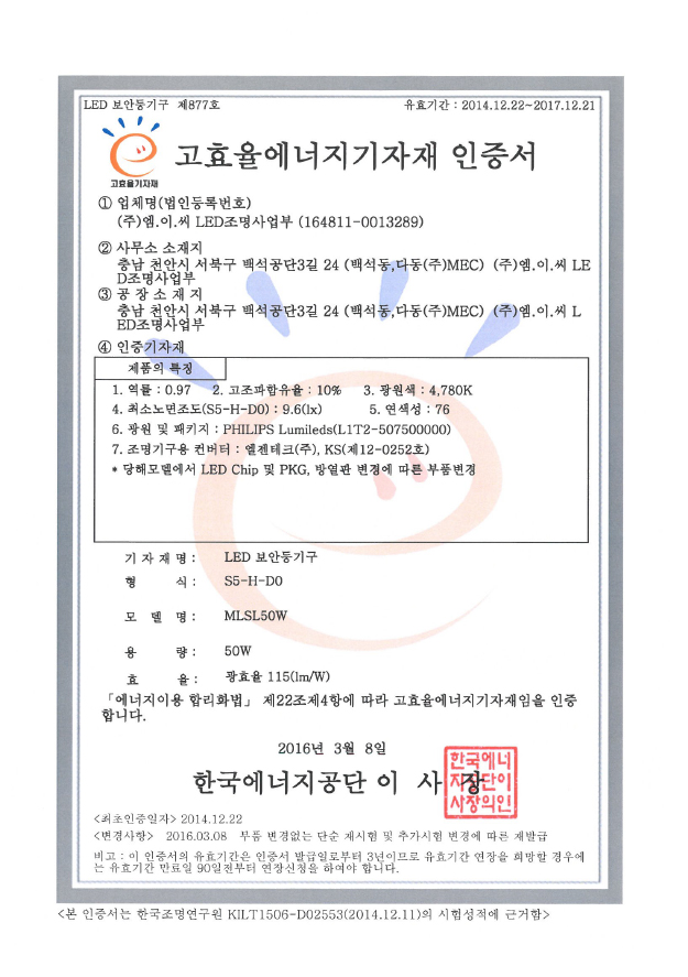 인증 | LED-보안등기구-제-877호-MLSL50W