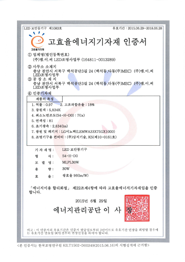 인증 | LED-보안등기구-제-1083호-MLPL30W