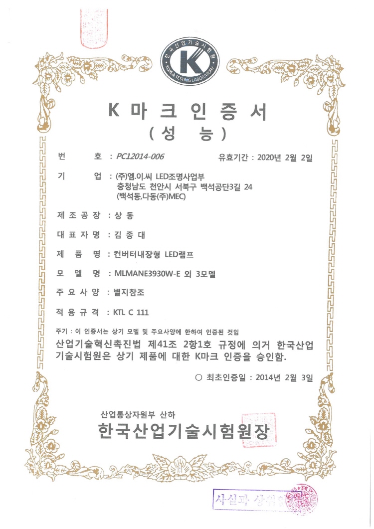인증 | K마크인증서(컨버터내장형 LED램프)