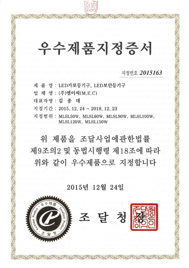 인증 | 우수제품지정증서(LED보안등기구,LED가로등기구)