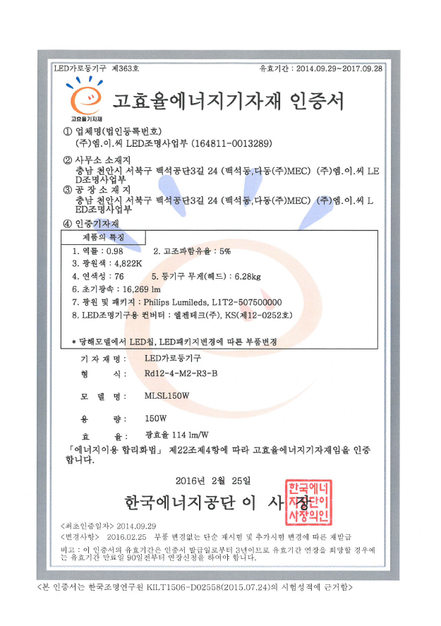 인증 | LED-가로등기구-제-363호-MLSL150W