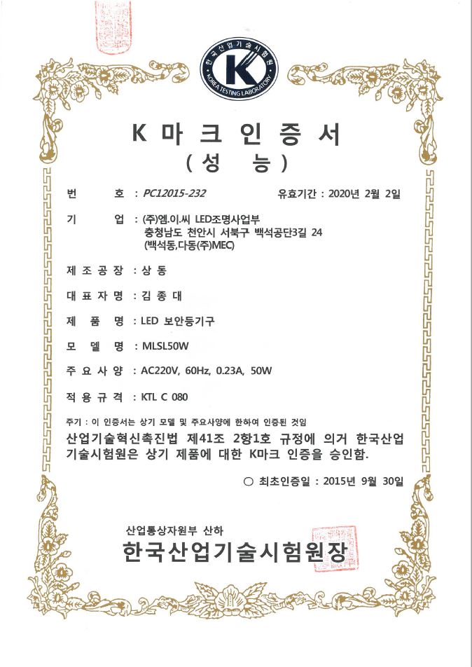 인증 | K마크인증서(LED보안등기구 50W)