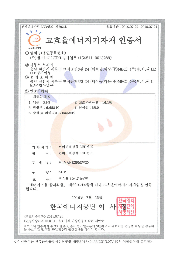 인증 | 제803호-LED램프-MLMANE3950W2S