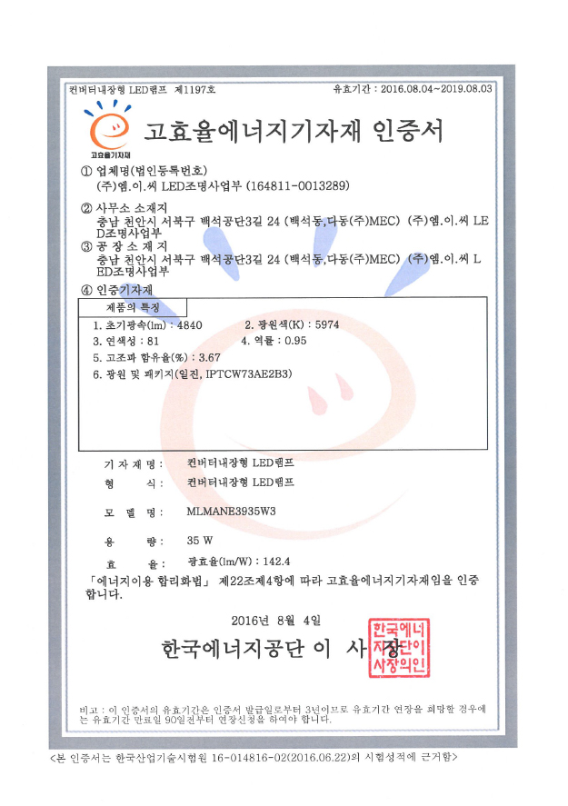 인증 | 제1197호-LED램프-MLMANE3935W3