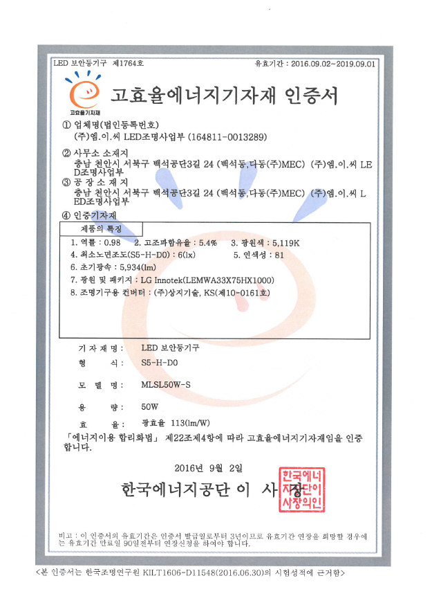인증 | 제1764호-LED-보안등기구_MLSL50W-S